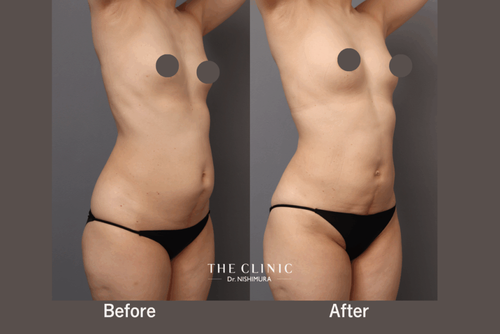 お腹、腰の吸引を行う事で、お腹周りにあった重たさがなくなり、くびれのメリハリがさらについて、腰の位置が高く見えるようになりました。下腹部には手術創の引きつれがあり、ポッコリ感が強調されていたため、ベイザーで丁寧に創の周りの皮下の癒着を剥離し、均一な厚みに吸引しました。傷痕の凹凸を目立たなくする技術です。皮下脂肪を均一に1㎝以下(6~8mm)の厚みにすることで、うっすら自然に腹筋のラインが見えるように仕上げています。それ以上吸引すると、色素沈着や皮膚の引きつれが出て、良くない見た目になります。