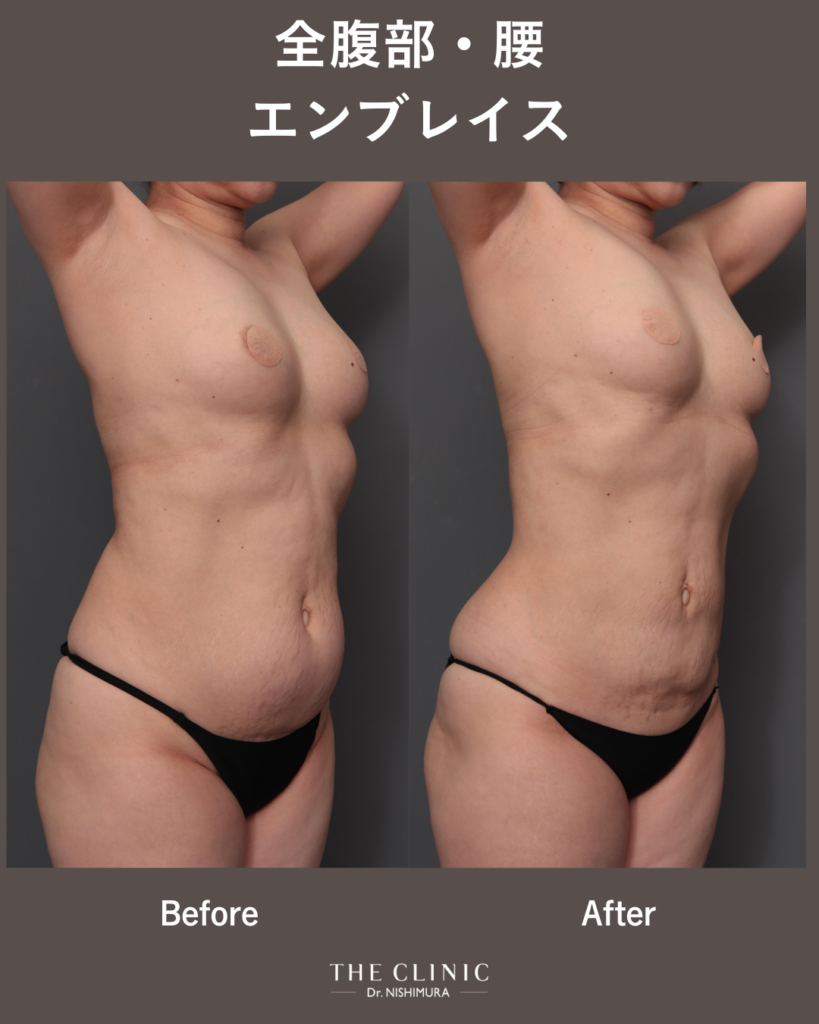 写真のゲストは50代の女性で、術前診察の時点で、すでに腹部の皮膚の弛み、肉割れがあった方です。特に下腹部は脂肪量も多く、皮膚も柔らかかったため、吸引をしっかりすれば確実に皮膚が弛む条件でした。脂肪吸引と同時にエンブレイスを上腹部と下腹部に行い、腹部全体に熱を加えてたるみを最小限に抑えることで、しっかりと綺麗に変化を出すことが出来ました。術前、術後3か月の写真で比較していますが、今後さらに皮膚の弛みは引き締まると思います。
