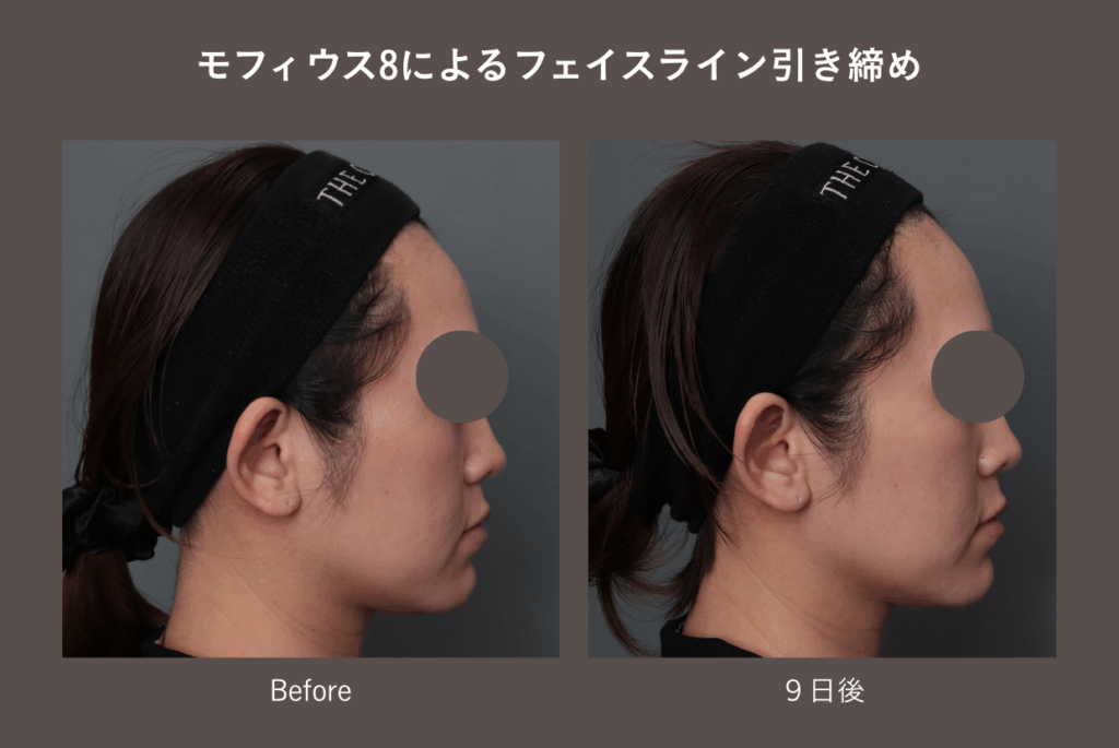 フェイスラインを綺麗に出したい場合に最も効果的なのは、頬と顎下のベイザー脂肪吸引なのですが、ダウンタイムが困る、脂肪吸引までするのはちょっと…という方にはモフィウスフェイスライン、顎下をお勧めします。切らないタイトニングとしては、最高級の変化をもたらせます。